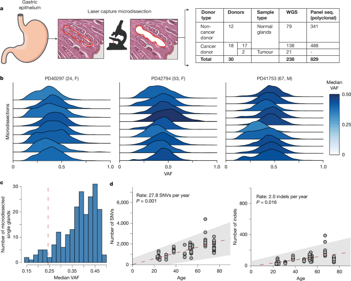 The research team used laser microdissection combined with whole-genome sequencing to analyze 238 microdissected samples from four gastrointestinal sites in 30 donors (including 18 gastric cancer patients) and performed targeted sequencing of cancer driver genes on 829 gastric lobule samples. The results showed: